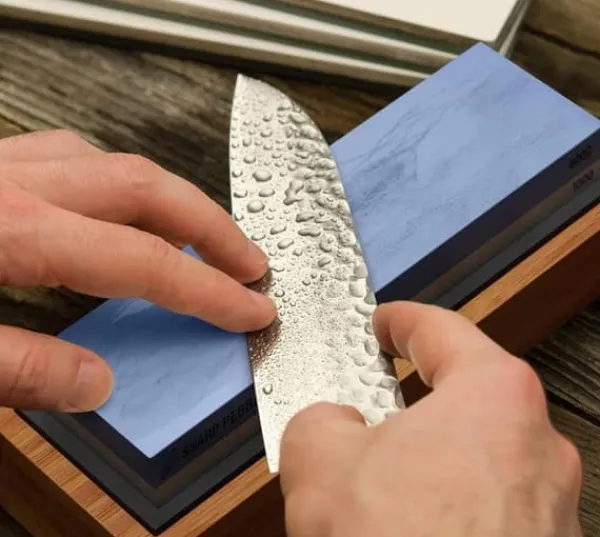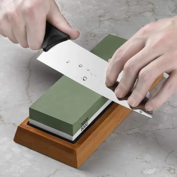 Dobbeltsidede slibesten (400/1000 og 3000/8000) til højpræcisionsslibning af køkkenknive, udendørsknive og sakse.