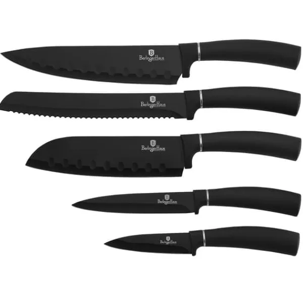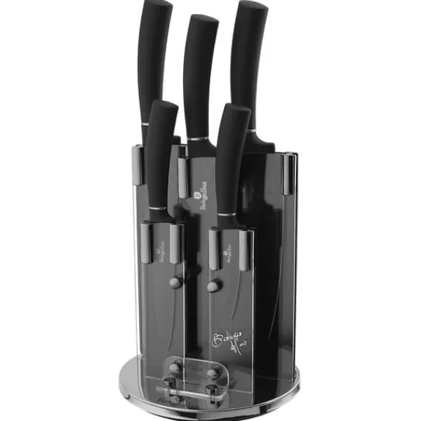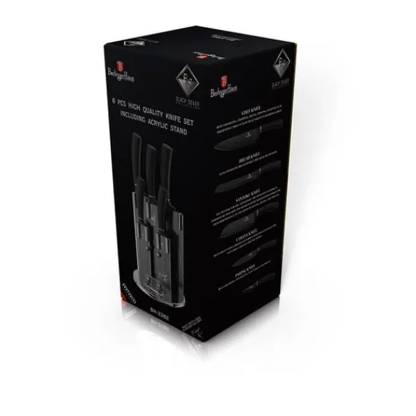 Et sæt 6-delte knive på stativ af BERLINGER HAUS fra Black Silver Collection-serien. Designet til at portionere kød og fisk, skære brød og skrælle og hakke grøntsager. Knive i rustfrit stål er desuden dækket med en non-stick belægning. Udstyret med håndtag dækket med et meget slidstærkt tyndt lag silikone for et fast greb under alle forhold. Egenskaber: Materiale: rustfrit stål med non-stick belægning Perfekt til hverdagsbrug, Rustfrit stålblade giver styrke og holdbarhed, Bevarer ikke madlugte, Vil ikke efterlade pletter, Ergonomisk SOFT TOUCH håndtag for komfort under skæring. Miljøvenlig ibenholt træimitation – indeholder ikke PFOA, bly eller cadmium Sættet indeholder: kokkekniv – 20 cm brødkniv – 20 cm Santoku-kniv – 17,7 cm universalkniv – 12,5 cm skrællekniv – 9 cm stativ akryl.