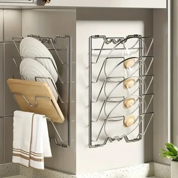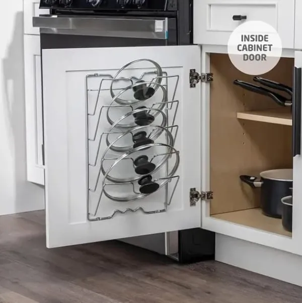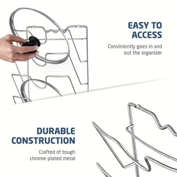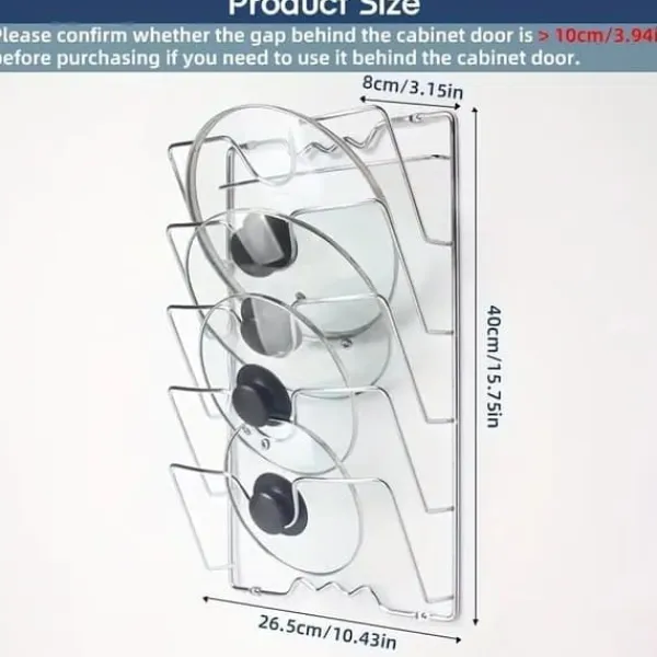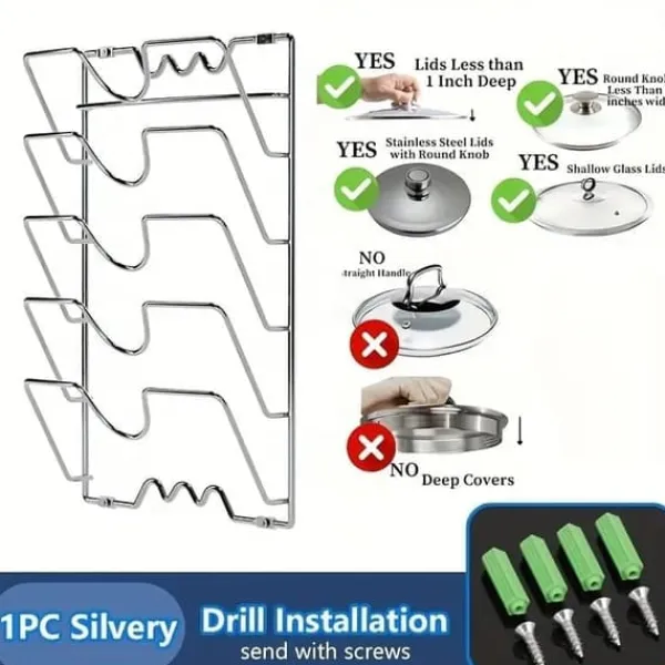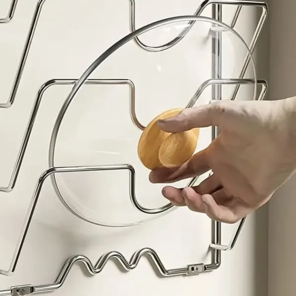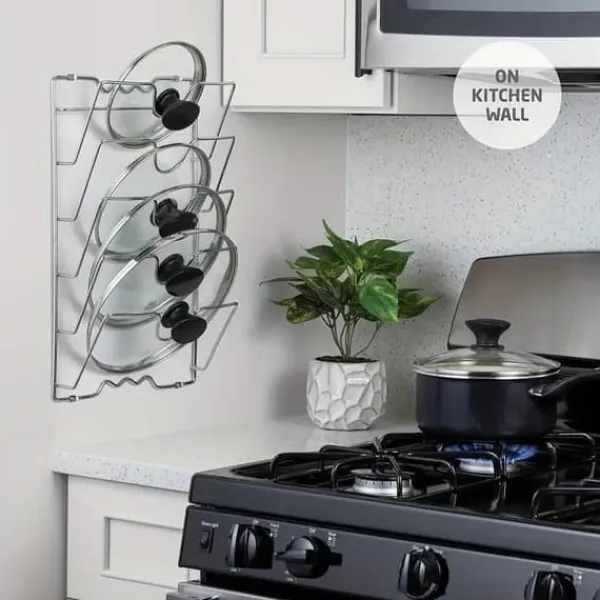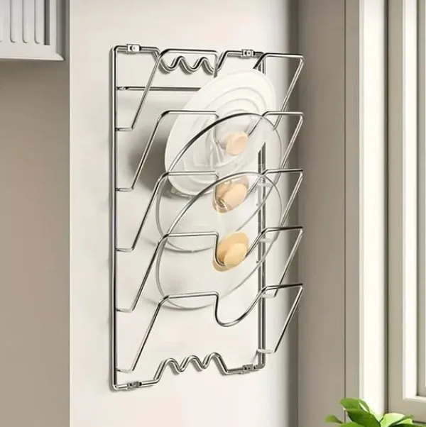 Hold dit køkken pænt og organiseret med denne robuste væghængte metalhylde til låg! Denne opbevaringsløsning i flere lag er perfekt til både hjem og restauranter, og den sparer plads og gør det nemt at holde gryder, pander og låg inden for rækkevidde.