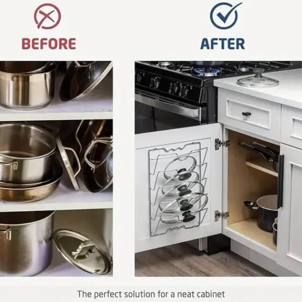 Opbevaring i flere lag: Flere niveauer til organisering af låg, gryder og pander i forskellige størrelser.