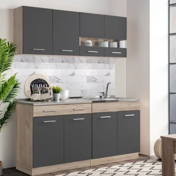 Denne moderne køkkenenhed er perfekt til små rum og tilbyder rigelig opbevaringsplads samt et stilfuldt gråt og egetræslook, der passer problemfrit ind i enhver indretning. Det kompakte design gør den ideel til studieboliger, studielejligheder eller kontorkøkkener, mens justerbare overskabe og modulopbygget udvidelsesmulighed giver fleksibilitet til at tilpasse efter dine behov. Let at samle og vedligeholde, denne køkkenenhed er en praktisk og elegant løsning til effektiv madlavning og opbevaring.
