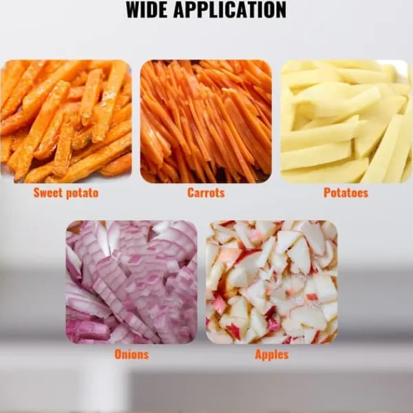 Denne højtydende hakker er ideel til både restauranter og private køkkener. Den kan bruges til at skære kartofler, gulerødder, agurker, æbler, pærer og andre grøntsager og frugter. Den er perfekt til alle, der ønsker at forberede grøntsager og frugter hurtigt og nemt til salater, pomfritter og desserter.