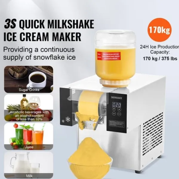 Denne snefnug-ismaskine er designet til at producere is effektivt og kontinuerligt. Med et højtydende luftkølesystem opnår den hurtig afkøling på kun 40 sekunder og producerer is på blot 3 sekunder efter forkøling. Maskinen kan producere cirka 375 lbs / 170 kg is om dagen, hvilket gør den ideel til forskellige drikkevarer såsom sukkerholdige drikke, alkoholholdige drikke med lav alkoholprocent, frugtjuicedrikke og mælk.