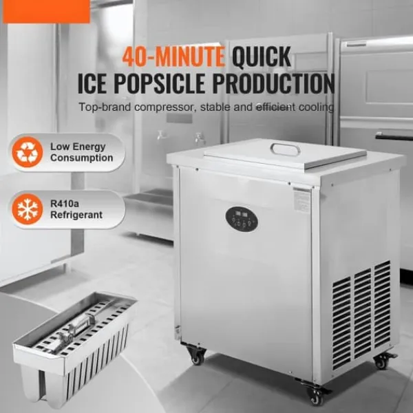Udstyret med en højkvalitetskompressor af mærket, kan kommerciel ispindsmaskine effektivt producere ispops hvert 40. minut i et stabilt tempo inden for de omgivende temperaturer fra 41 til 100,4°F. Den fungerer med minimalt støj- og energiforbrug og sikrer en jævn produktionsproces. Maskinen lever op til kravene om effektivitet og hastighed og er ideel til kommerciel brug.
