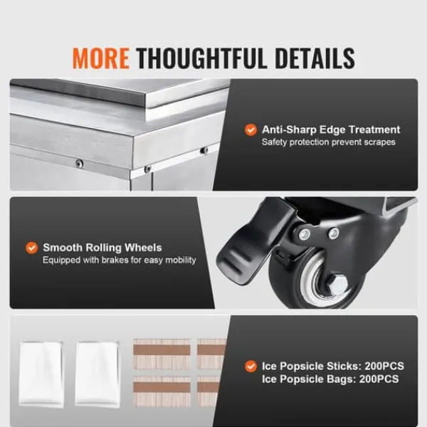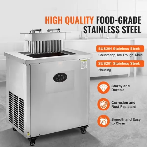 Fremstillet af fødevaregodkendt SUS304 rustfrit stål til bordpladen, iskarret og formen, og SUS201 rustfrit stål til huset, er vores enkeltformsæt-ispops-maskine korrosionsbestandig, nem at rengøre og har afrundede kanter til øget sikkerhed og komfort. Den holdbare konstruktion garanterer en lang levetid og pålidelig ydeevne.