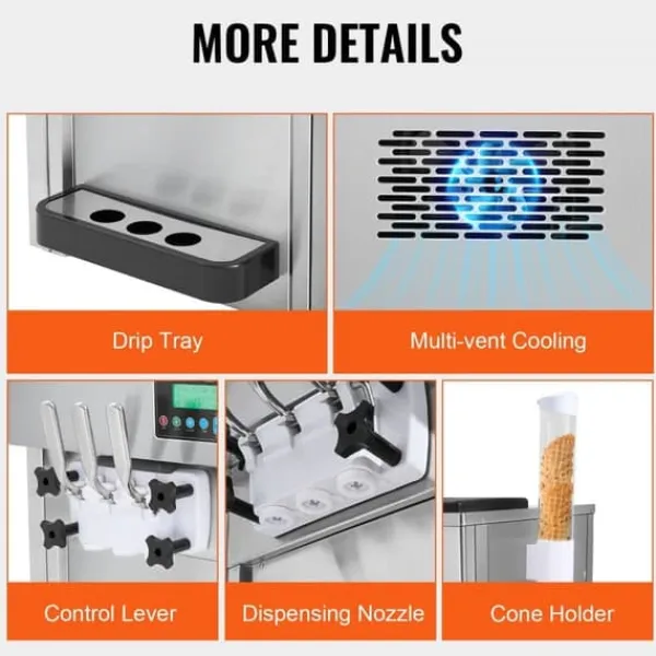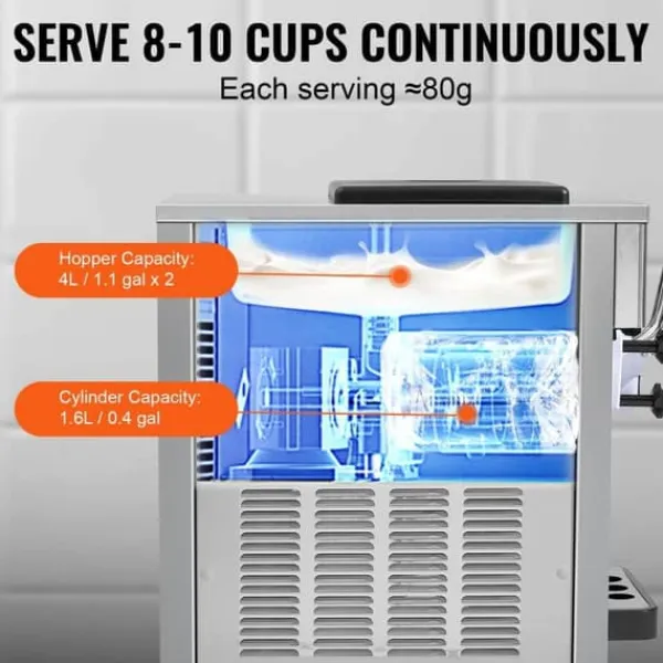 Robust & holdbar: Softice-maskinen til kommercielt brug er fremstillet af rustfrit stål SUS201 og har en cylinder af fødevaregodkendt rustfrit stål SUS304. Den er ikke kun robust og rustbestandig, men også let at rengøre, hvilket sikrer både holdbarhed og fødevaresikkerhed.