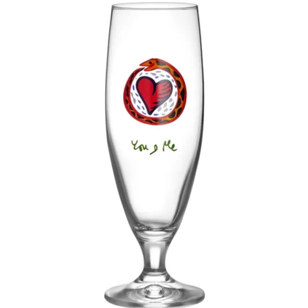Friendship Ølglas You and Me 50cl fra Kosta Boda. Friendship er en serie af håndblæste øl- og vinglas med unikke og kærlige designs skabt af Ulrica Hydman Vallien. En serie af glas, der både er sjove at samle på og at dække bordet med. Ulrica var et farverigt ikon i svensk kunst og havde en legesyg tilgang til alt, hvad hun skabte.