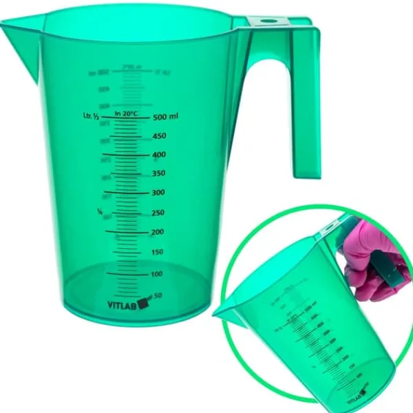 Transparent PP-bægerglas 500 ml lavet af højkvalitets polypropylen (PP) . Udstyret med en læselig, trykt skala hver 10 ml på begge sider og et stabilt håndtag med en profileret fordybning, der muliggør vanddræning under vask. Bægerglasset opfylder kravene til fødevarekontakt i overensstemmelse med forordning (EU) nr. 10/2011 og muliggør præcis dosering af væsker.
