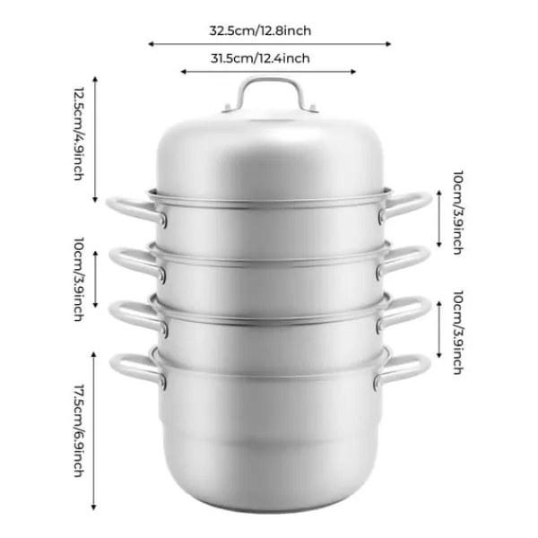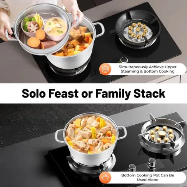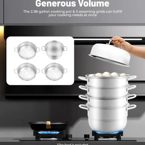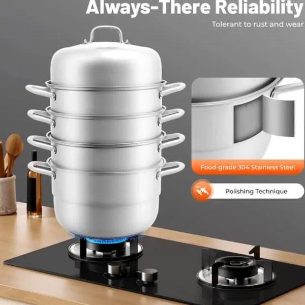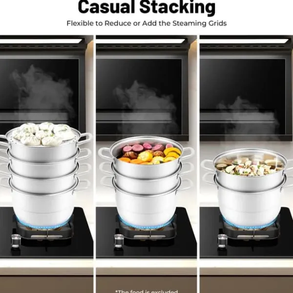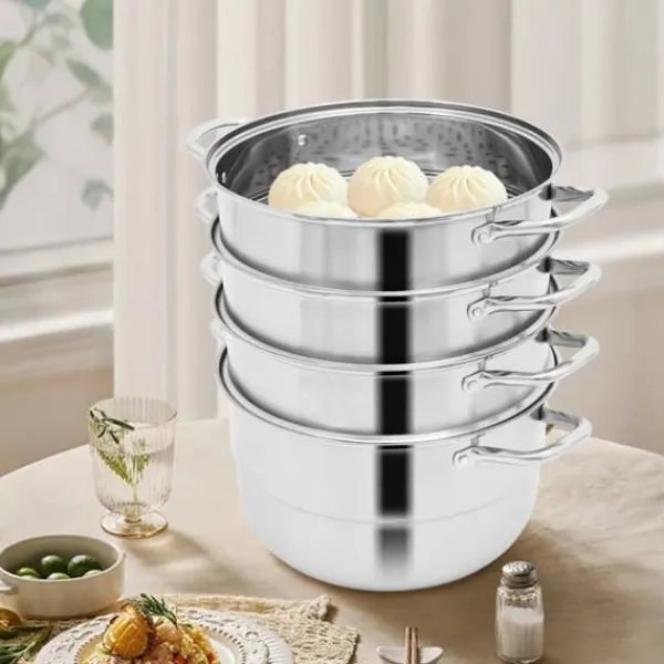 Stabelbar dim sum-damper i 304 rustfrit stål – 9 l, 5 niveauerDenne kraftige damper i 304 rustfrit stål bevarer næring og saftighed. Med 5 etager og en gryde på 9 l kan du tilberede flere retter på én gang – ideel til familien.