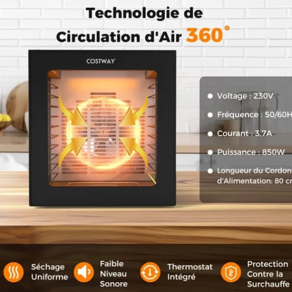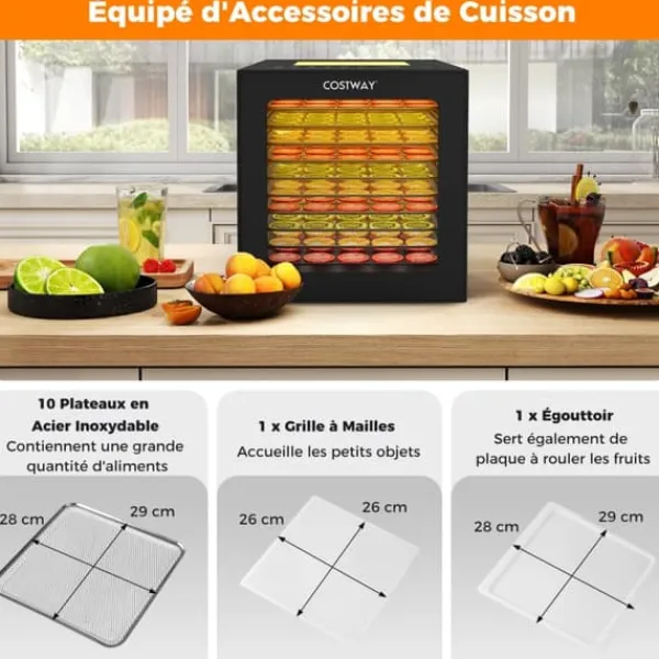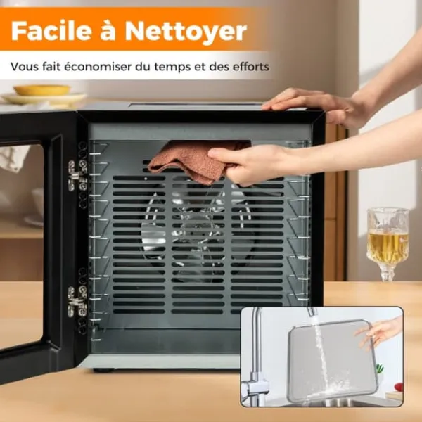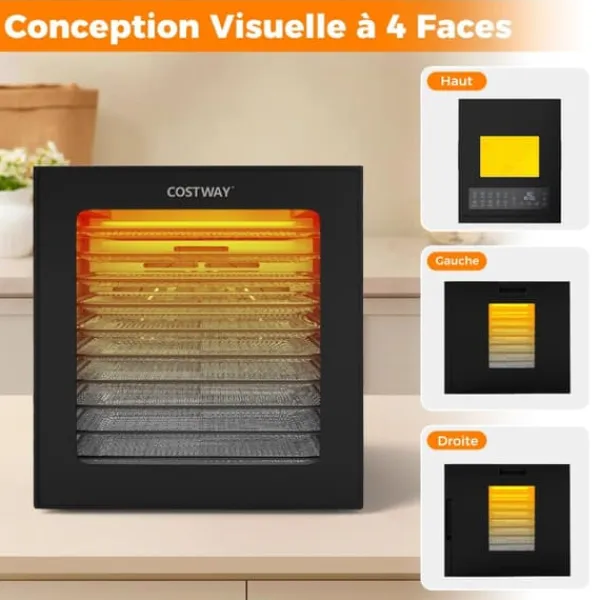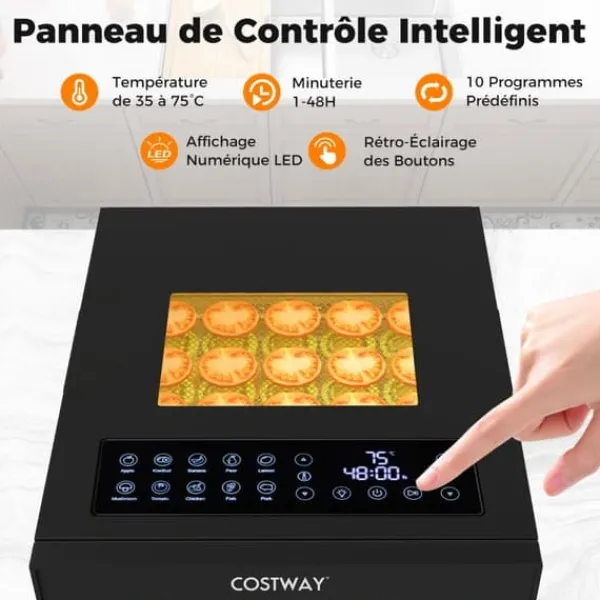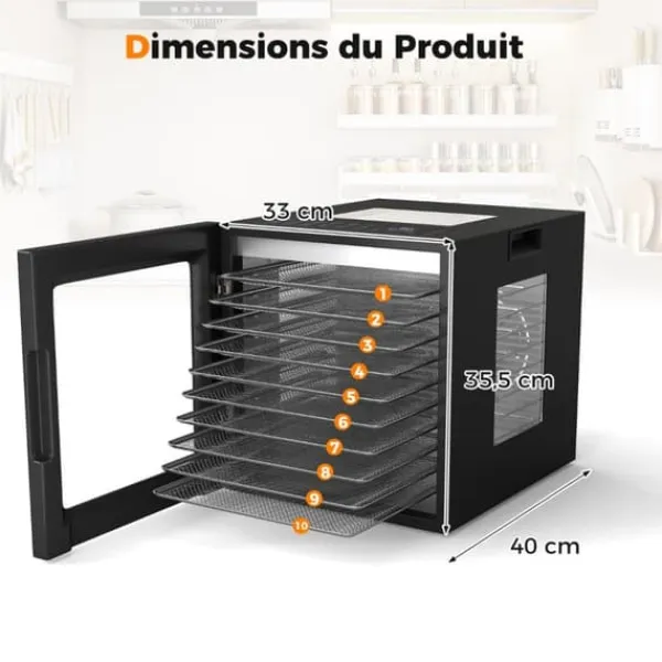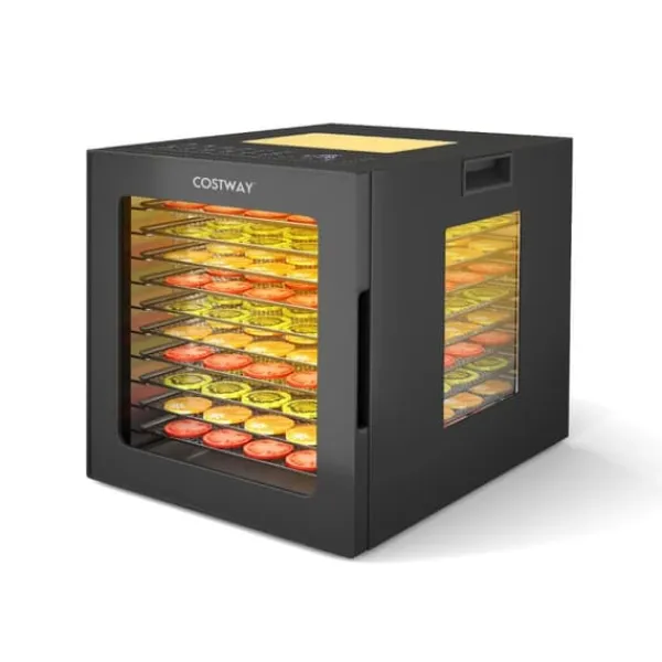 Denne Fødevaredehydrator har avanceret 360° luftcirkulationsteknologi og 10 forudindstillede programmer for at sikre jævn og tilpasselig tørring af forskellige fødevarer. Dens fire-sidede vinduer med LED-lys, robuste konstruktion og medfølgende tilbehør gør den til et bekvemt og pålideligt apparat til tilberedning af tørrede frugter, grøntsager, kød og mere.