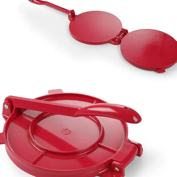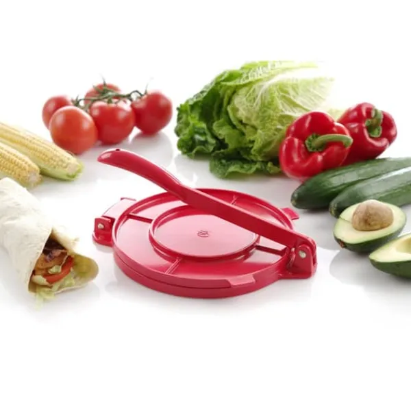 Producentnummer: 513033 Manuel tortillapresse Produktegenskaber: – maksimal tortilladiameter 200 mm – lavet af rød pulverlakeret aluminiumslegering. Parametre: – mål: 255x202x(H)95mm Leveringsomfang: – Manuel tortillapresse