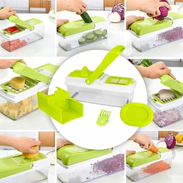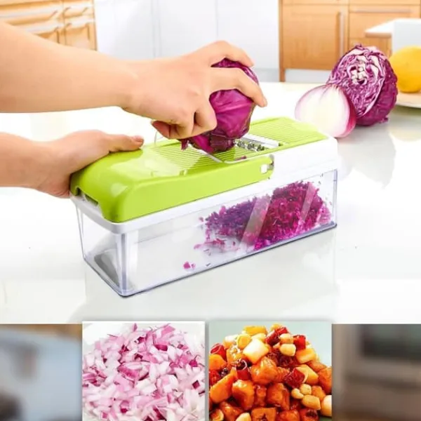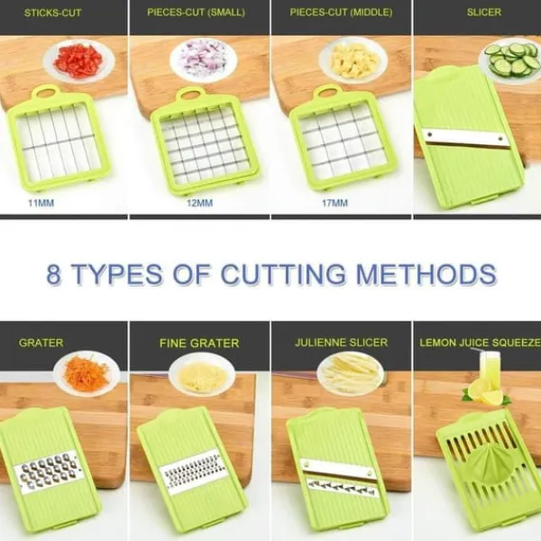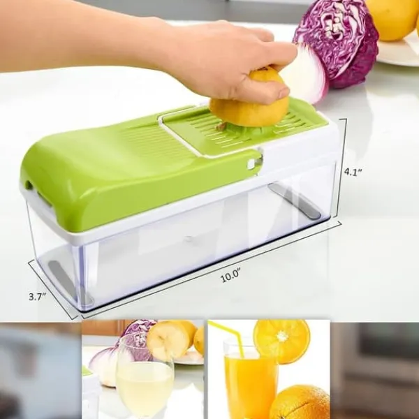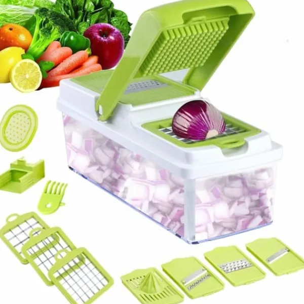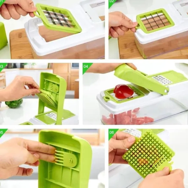 Lækkert uundværligt mandolinjern med multiple funktioner. Den perfekte køkkenassistent for nem tilberedning af de lækreste retter. Mandolinjernet river, snitter og skærer i grøntsager, frugt, ost og meget andet let. Der medfølger 13 dele til Nicer Dicer Plus mandolinjern. Produktet er opfundet i tyskland og leveres med 6 forskellige laserslibede knivindsatser af rustfrit stål. Skær dine grøntsager på et utal af forskellige måder. Du kan fx skære kartofler i skiver på 11 forskellige måder. Når de er skåret ryger stykkeren direkte ned i beholderen – klar til servering.