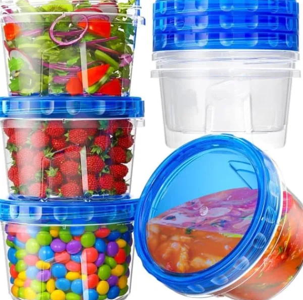 6-pak med 500 ml runde plastkasser med låg – perfekt til supper, grød, gryderetter, saucer, rester, pasta, snacks og morgenmadsprodukter.
