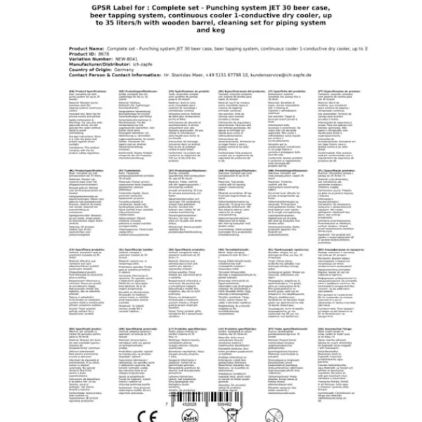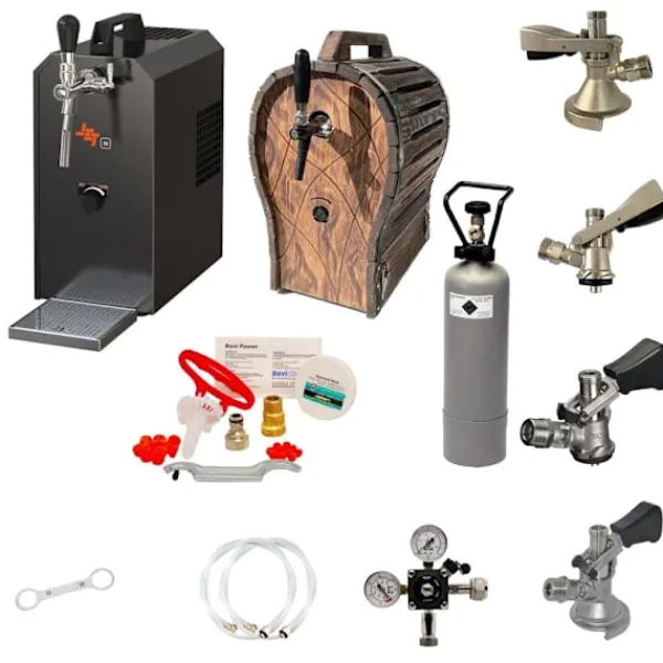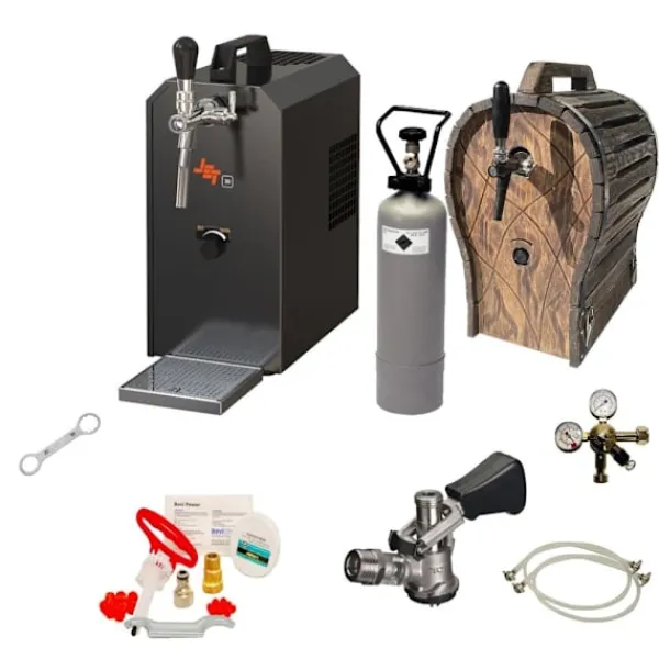 Komplet sæt fadølsanlæg – JET 30 1 linje tør køler, 35 liter/h med trætønde, Rengøringssæt til fadølsanlæg og keg Består af: •JET 30 1 linje tør køler, 35 liter/h •Trætønde til fadølsanlæg JET 30•Rengøringssæt til fadølsanlæg og keg:•10 rengøring svampe for 7mm •1 kl. Dosisdispensering fedt •Rengøring adaptere til drikkedispenseringskonstruktionerne haner med en øl tryk tråd på 30mm•Kegreinigungsbürste for kombination og flad montering•dispensering nøgle•metal – Gardena tilslutning til rengøring adapter•30g Bevi Power, rengøring pulver•trykreduktionsventilen 1 linje CO2 for øl dispenser 3 bar•CO2 – flaske, 2,0 kg•CO2 slange komplet, 1,5 m•øl Bong John Gæst – 3/8 og 5/8 skrue-on stik 2,00 m – helt færdig•kulsyre nøgle fangenskab•pin hoved, dit valg: ingen, flad, stationcar, kurv, Kopi, 5 liter tromle-adapter Fadølsanlæg – JET 30 1 linje tør køler, 35 liter/h PDF-artikeloplysninger om JET 30-dispenseringssystemet kan findes her JET 30 øldispenser 35 liter/t,Ølboks, flowkøler, tørkøler 3 min udpakning… 2 min opsætning… 1 min tilslutning = uendeligNyd en kold, klar, frisktappet drink – du fortjener det!Jet 30 ølkøleren er fremragende til professionel køling og servering af kølet øl derhjemme, til havefester og til mindre kommercielt brug. •Kontrolområde+2 til +10 grader•Ydeevne:35 l/t ved 10 ° C TD•Køleteknologier 45 % mere effektiv•Klar til brugpå kun 2-4 minutter Hvis termostaten er indstillet til max., vil termoblokken (efter ca. 10 minutter) akkumulere en høj mængde energi, hvorved der kan serveres flere kølede øl efter hinanden.Køleteknologien i JET 30-hanesystemet er omkring 45 % mere effektiv end det elektriske strømforbrug.Øllen køles ned til hanen.Kølesløjferne er lavet af rustfrit stål og er derfor stabile og holdbare. De anvendte materialer opfylder de højeste hygiejnestandarder og gør det muligt for køleren at have en lang levetid. JET 30 – Stærk og hurtig som et jetfly Med sin stærke køleydelse og perfekte dimensioner er JET 30-dispenseren en af de førende bord-/under-bordskølere på markedet. Kølekapacitet på 40 til 60 glas (0,5 liter) fremragende kølet øl i timen, Den kraftfulde JET 30-kompressor sikrer minimalt energiforbrug og en fremragende afkølet øl uden skum Kontinuerlig flow-køler JET 30 – effektivitet, ydeevne, nydelse Termoblokken i JET 30 ølhanesystemet har en høj energikapacitet, hvilket betyder, at en perfekt afkølet øl kan tappes efter blot 2-4 minutter. Hvis termostaten er indstillet til maks., vil termoblokken akkumulere en høj mængde energi (efter ca. 10 minutter), hvilket gør det muligt at servere flere kølede øl i træk. Køleteknologien i JET 30-dispenseren er omkring 45 % mere effektiv end det elektriske strømforbrug. Øllen afkøles til hanen. Kølesløjferne er lavet af rustfrit stål og er derfor stabile og holdbare JET 30 flowkøler – tekniske data Den ædle JET 30 tørkøler, der kun vejer 14,5 kg, er udstyret med et 7 mm kabel.Høj kvalitet af udførelse og emballage •Mål: B/D/H/ 167/281/(inklusive drypbakke)/368 mm•Spænding: 230V , 50 Hz, 267W, 1,16A•Kompressor:1/8 HK•Linje:1 x øl•Hus:Metal, pulverlakeret, rustfrit JET 30 – Top i sin klasse JET 30 ølkøleren er en af de bedste i kategorien dispenseringssystemer op til 35 l/t med hensyn til omkostninger,ydelse og kvalitetsforhold. Nem rengøring af JET 30-systemet Med følgende rengøringssæt kan du nemt og bekvemt rengøre JET 30-dispenseren efter brug: Rengøringssæt lille Nem rengøringssæt (anbefales) Rengøringssæt stort Ølkøler JET 30 – nem at bruge – TOP i ydeevne Den trykkes på i nogle få trin: Udpak tapesystemet Tilslut trykreduceren til CO2-flasken ved hjælp af kuldioxidnøglen, og spænd den til Tilslut CO2-slangen fra trykreduceren til dysehovedet Tilslut ølslangen til hanehovedet og indsæt den i hanesystemet og fastgør den Prik tønden Indstil taptrykket på trykreduceren Tilslut dispenseren til stikkontakten Juster trykket og nyd en kold øl Du kan finde alle komponenter i det komplette sæt eller som tilbehør i vores butik