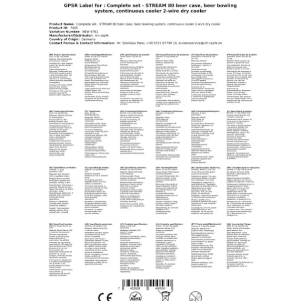 Komplet Sæt -fadølsanlæg – STREAM 80 ølkasse, flowkøler 2-linet tørkøler Består af:•STREAM 80 ølkasse, flowkøler 2-linet tørkøler!•Features:tilslutninger John Gæst•1 x Regulator 2 linjer CO2 for øl dispenser 3 bar•1 x CO2 – flaske 2,0 kg•2 X CO2 slange komplet, 1,5 m•2 X øl slange John Gæst – 3/8 og 5/8 skrue-on stik 2,00 m – helt færdig•kulsyre nøgle fangenskab•2 x pin hoved, dit valg: ingen, flad, stationcar, kurv, Kopi Zapfanlæg STREAM 80 Ølkasse, gennemløbskøler med 2 rør, tørkøler, op til 90 liter/timeZapfanlæg STREAM 80 Ølkasse, gennemløbskøler med 2 rør, tørkøler, op til 90 liter/time3 minutter at pakke ud… 2 minutter at opstille… 1 minut at tilslutte = uendelig nydelse.En kold, klar, frisktappet – du har fortjent det!Ølkøleren STREAM 80 2lt er designet til professionel køling og udskænkningaf fremragende afkølet øl i hjemmet, til havefesterog til mellemstore kommercielle formål.•Reguleringsområde+2 til +10 grader•Ydelse:90 L/time ved 10°C TD•Køleteknologier 45% mere effektiv•Klar til brugpå kun 5-10 minutterHvis termostaten indstilles på Max.,vil termoblokken (efter ca. 10 minutter) akkumulere en stor mængdeenergi, og dermed muliggøre udskænkning afflere afkølede øl efter hinanden.Køleteknologien i STREAM 80 Zapfanlægget er omkring 45% mere effektiv end det elektriske effektforbrug.Øllet køles ned til taphanen.Kølesløjferne er lavet af rustfrit stål og er derfor stabile og holdbare.De anvendte materialer opfylder de højeste hygiejnestandarder og sikrer en lang levetid for køleren. STREAM 80 2lt – og den kolde øl strømmer fra 2 hanerMed sin stærke køleydelse og perfekte dimensioner hører ølanlægget STREAM 80 til de førende 2-kanals bord-/underbordskølere på markedet.Køleydelse fra 170 til 180 glas (0,5 liter) fremragende afkølet øl pr. time,Den kraftige kompressor i STREAM 80 sikrer minimalt energiforbrug og fremragende afkølet øl uden at skummeGennemløbskøler STREAM 80 2ltg. – Effektivitet, Ydelse, NydelseTermoblokken i STREAM 80 Bierzapfanlægget har høj energikapacitet, således at der allerede efter 5-10 minutter kan tappes perfekt afkølet øl.Hvis termostaten indstilles på Max., vil termoblokken (efter ca. 10 minutter) akkumulere en stor mængde energi, og dermed muliggøre udskænkning af flere afkølede øl efter hinanden.Køleteknologien i STREAM 80 Zapfanlægget er omkring 45% mere effektiv end det elektriske effektforbrug.Øllet køles ned til taphanen.Kølesløjferne er lavet af rustfrit stål og er derfor stabile og holdbare.De anvendte materialer opfylder de højeste hygiejnestandarder og sikrer en lang levetid for køleren.Gennemløbskøler STREAM 80 – Tekniske specifikationerDen elegante STREAM 80 tørkøler med en vægt på kun 45 kg er udstyret med en 7 mm ledning.•Mål:(BxDxH) 255х635х510 mm (inkl. drypbakke)•Strøm:220V, 50 Hz, 764W, 4,3A•Kompressor:3/8 PS•Ledning:2 x øltyper•Kabinet:Metal, pulverlakeret, rustsikkerHøj kvalitet af bearbejdning og emballering STREAM 80 – Topklasse blandt 2-kanals ølanlægØlkøleren STREAM 80 er i kategorien Ølanlæg op til 90 l/time en af de bedste med hensyn til pris-,ydelses-, kvalitetsforhold.Let rengøring af STREAM 80Med følgende rengøringssæt kan du nemt og bekvemt rengøre STREAM 80 øltappelægget efter brug:Rengøringssæt lilleNem rengøringssæt(anbefales)Rengøringssæt stortZapfanlæg STREAM 80 – Ølkasse, gennemløbskøler med 2 rør, tørkøler, op til 60 liter/timeDet er hurtigt at tappe:Pak zapfanlægget udForbind reduktionsventilen til CO2-flasken med hjælp fra kulsyreslange-nøglen og stram tilForbind CO2-slangen fra reduktionsventilen til taphovedetForbind ølslangen til taphovedet og indsæt og fastgør den i zapfanlæggetStik fatningenIndstil trykket på reduktionsventilenForbind zapfanlægget til stikkontaktenIndstil trykket og nyd en kold øl