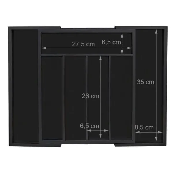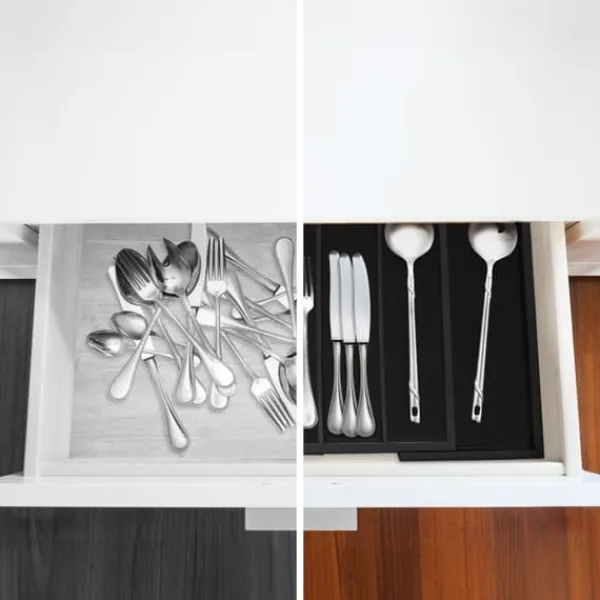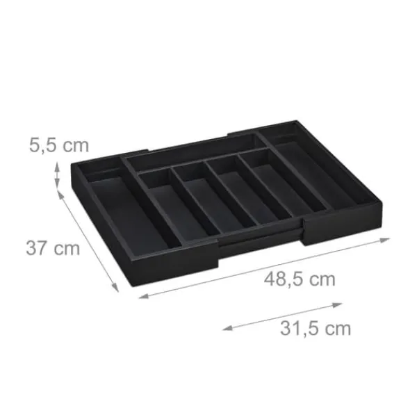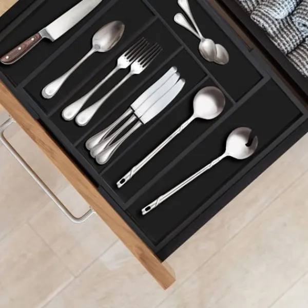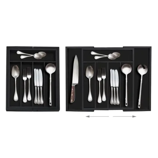 Hold dine køkkenskuffer organiserede med denne udtrækkelige bestikbakke i bambus, designet til at sortere knive, gafler, skeer og andet køkkenredskab. Den justerbare bredde og de mange rum gør den velegnet til både små og store skuffer, mens den elegante sorte finish tilføjer et stilfuldt præg. Fremstillet af naturlig bambus, er den også ideel til organisering af hobby- og sytilbehør.