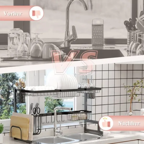 To-etagers opvaskestativ med modulært design til effektiv organisering og tørring af forskellige køkkenartikler, herunder tallerkener, skåle, bestik og skærebrætter. Robust stålkonstruktion og sugekopper sikrer pålidelig støtte og stabilitet nær vasken.