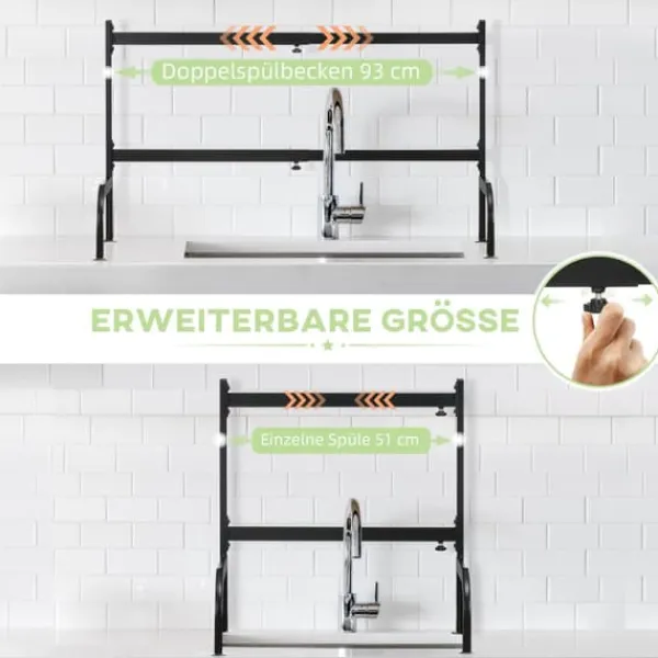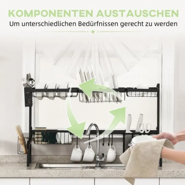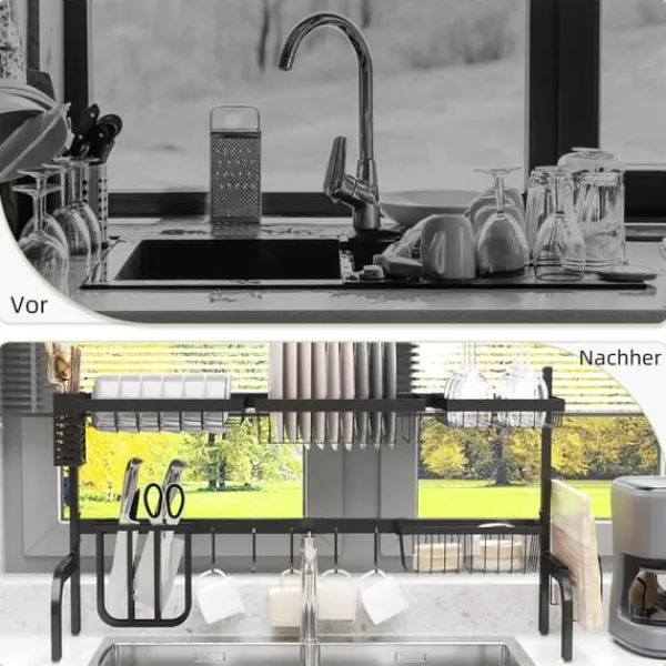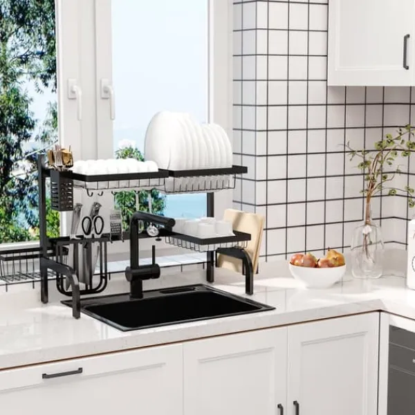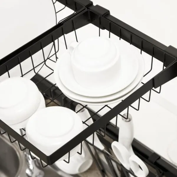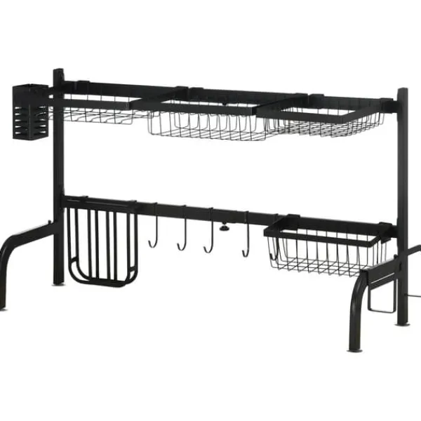 To-etagers opvaskestativ, designet til at maksimere køkkenplads ved at placere det over vasken, hvilket holder din bordplade fri og tør. Det har flere rum og holdere til tallerkener, bestik og køkkenredskaber, med justerbar længde og robust stålkonstruktion for alsidig og holdbar brug.