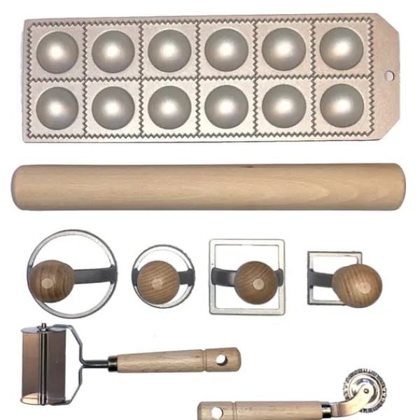 Indeholder: 1 stk. 12-hullet ravioli-form i aluminium, 1 stk. vinklet hjulspore, 1 stk. 6 x 6 cm hjulskærer, 1 stk. 7 x 7 cm firkantet – 1 stk. 4 x 4 firkantet – 1 stk. 8 cm rund- 1 stk. 6 cm runde ravioli-udstikker og en 34 cm pastarulle. Materialerne er bøg, rustfrit stål og aluminium.