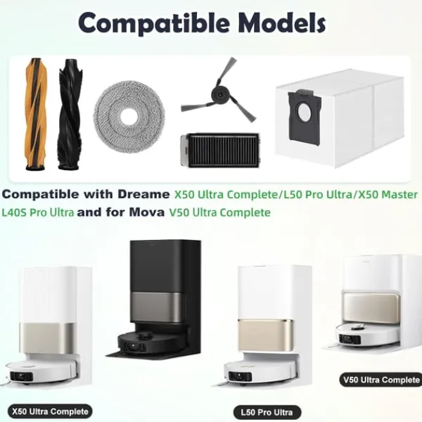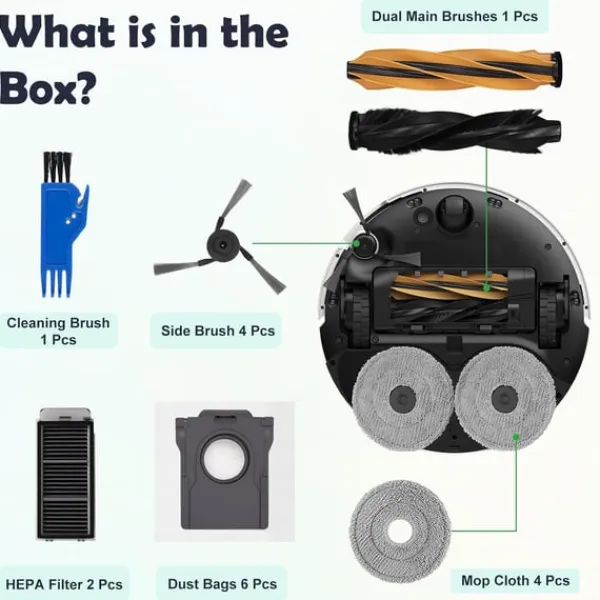 Omfattende udskiftningssæt: Dette tilbehørssæt giver et komplet sæt reservedele til din Dreame robotstøvsuger, hvilket sikrer optimal ydeevne og lang levetid. Det inkluderer essentielle komponenter såsom hovedbørsten, filtre, sidebørster, moppepuder og støvposer, alle designet til at fungere problemfrit med din enhed. Regelmæssig udskiftning af disse dele hjælper med at opretholde rengøringseffektiviteten og forlænger levetiden på din robotstøvsuger.