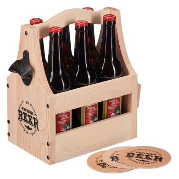 Flaskeholder til 6 ølflaskerMens traditionelle papølholdere ofte får mænd til at bekymre sig om at miste deres elskede tørstslukkere, sikrer denne træølholder, at de kan transporteres fra A til B på en kølig og sikker måde. Flaskekurven rummer op til seks 0,5-liters flasker. Takket være sideåbneren og ølmåtterne er der intet, der står i vejen for at nyde en kølig øl med det samme. Flaskeholderen er fyldt med et udvalg af øl og er en fantastisk gave til fars dag eller en fødselsdag.