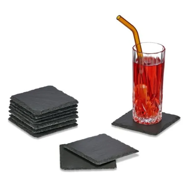 Firkantede glasunderlag til bordet Disse firkantede skiferglasunderlag giver din borddækning et dekorativt, rustikt look, samtidig med at de beskytter overfladen. Placeret under cocktailglas, tekopper, ølglas eller vinglas forhindrer underlagene grimme vandpletter eller andre spildte drikkevarer. Ridser forhindres af den beskyttende belægning på undersiden af vinunderlagene. De små skifertallerkener ser også smukke ud under raclettepander eller som lysestager. Bemærk: Skifer er et naturprodukt. Denne lagdelte sten kan ikke slibes 100% lige. Brækkede kanter kan variere. Små variationer i tykkelse, længde og bredde kan derfor også forekomme. Tørres af med en fugtig klud før første brug.