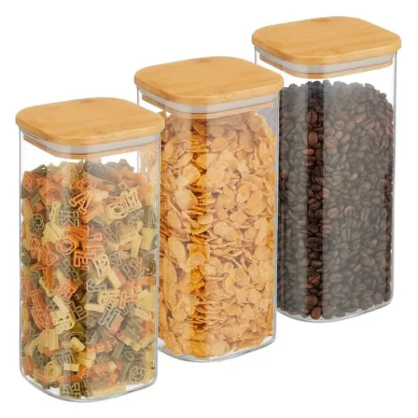 Firkantede opbevaringsbeholdere i glas Dette praktiske sæt med tre opbevaringsbeholdere i glas giver dig mulighed for at opbevare din mad på en pladsbesparende og organiseret måde. Uanset om det er pasta, ris, småkager, müsli, cornflakes eller kaffebønner – disse opbevaringsbeholdere i glas er alsidige. Morgenmadsbeholderne er lavet af glas og har et bambuslåg med en silikonering, der sikrer en lufttæt forsegling og holder indholdet frisk i længere tid. Takket være deres transparente design er de fyldte opbevaringsbeholdere til køkkenet også et rigtigt blikfang.