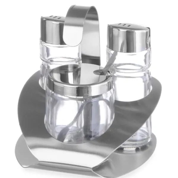 Producentnummer: 465332 Krydderisæt – 3 stk – salt, peber og sennep – Med sennepsske af 18/0 rustfrit stål – Satinbehandlet Parametre: – længde: 100mm – bredde: 95mm – højde: 115mm Sættet indeholder: – Krydderi sæt