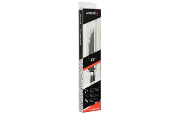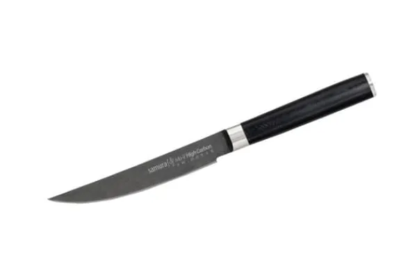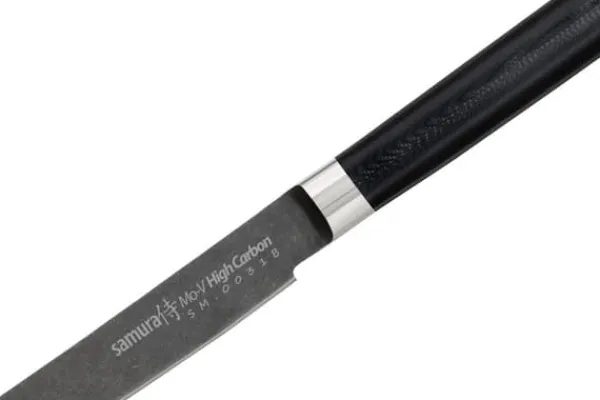 V Stonewash 4.7″ Steakkniv er et enestående køkkenredskab designet til både professionelle kokke og madlavningsentusiaster derhjemme. Fremstillet af førsteklasses japansk stål, kombinerer denne steakkniv holdbarhed med præcision, hvilket sikrer ubesværet skæring gennem selv de mest saftige kød. Dens fint slebne klinge tilbyder enestående skarphed, hvilket forbedrer den samlede spiseoplevelse ved at tillade rene, glatte skiver, der bevarer integriteten af den præsenterede ret.Den unikke stonewashed finish giver ikke kun et æstetisk tiltalende udseende, der komplementerer ethvert køkken, men tilføjer også et ekstra lag styrke til klingen. Dette innovative design forhindrer ophobning af mad og bakterier, hvilket sikrer en hygiejnisk skæreflade, der er nem at rengøre og vedligeholde. Knivens ergonomiske håndtag forbedrer yderligere brugerkomfort og kontrol, hvilket gør den ideel til længerevarende brug, hvad enten det er ved grillen eller ved elegant anretning af måltider til familie og venner.Forbedr din kulinariske oplevelse med Samura MO