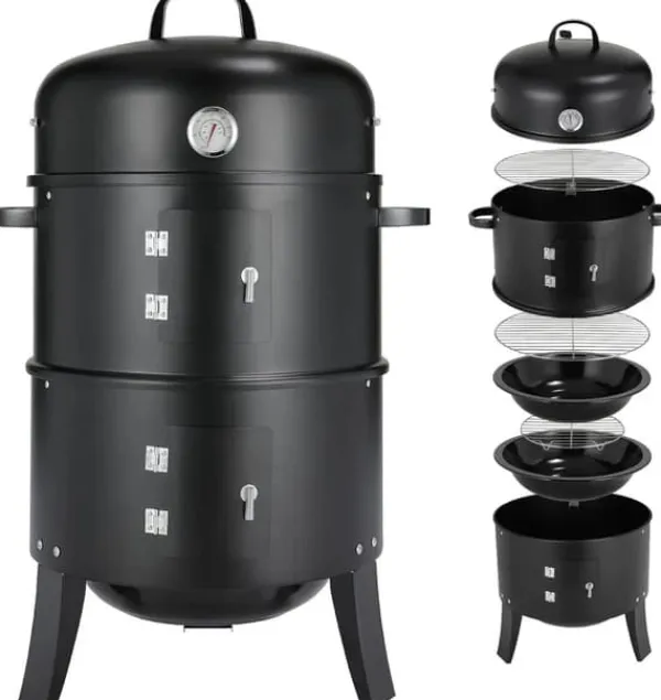 3-i-1 kulgrill-smoker med håndtag Alsidig rundsmoker til røgning, grillning og langsom tilberedning. To rustfri grillriste (Ø ca. 38 cm) giver rigelig plads, og sidehåndtag gør den nem at flytte. Lågets termometer, justerbar lufttilførsel og vandfad sikrer stabil varme og klassisk røgsmag.