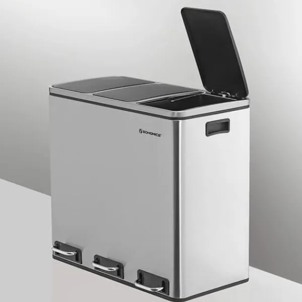 Återvinning kan vara enkelt: Med 3 sektioner sida vid sida kan du sortera din återvinning och sopor med en enkel släng. Allt du behöver göra är att trampa på pedalen för att öppna locket, och du har nu händerna fria att slänga ditt skräp eller återvinning. Utan att behöva röra något med händerna är det mer hygieniskt. De 3 hinkarna inuti har handtag så att de enkelt kan lyftas ut och tömmas.