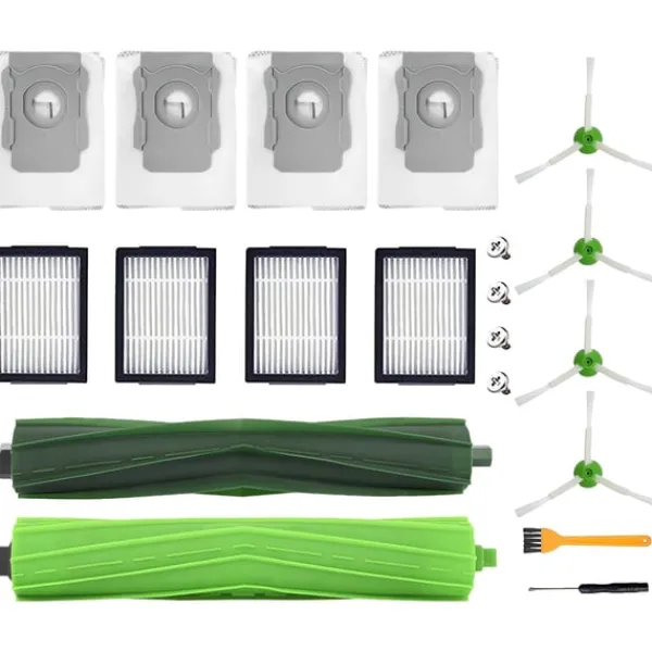 Tilbehørssæt til iRobot Roomba i1+ i7 i7+ i3+ i4+ i6+ i8+ J7+ Plus I & J Plus-serien. Indeholder reservedele som gummibørster, sidebørster, støvsugerfiltre, støvsugerposer og værktøj, i alt 16 dele.