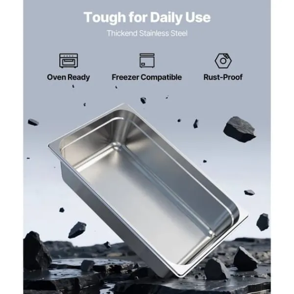 Rustfrit stål i kommerciel kvalitet: Vores hotelpande i rustfrit stål er lavet af 22-gauge SS201 rustfrit stål, der sikrer langvarig holdbarhed og enestående rustbestandighed. Dette gør den ideel til diverse madvarer og sikrer, at den kan anvendes i køleskabe, frysere og opvaskemaskiner, der kræver høje temperaturer.
