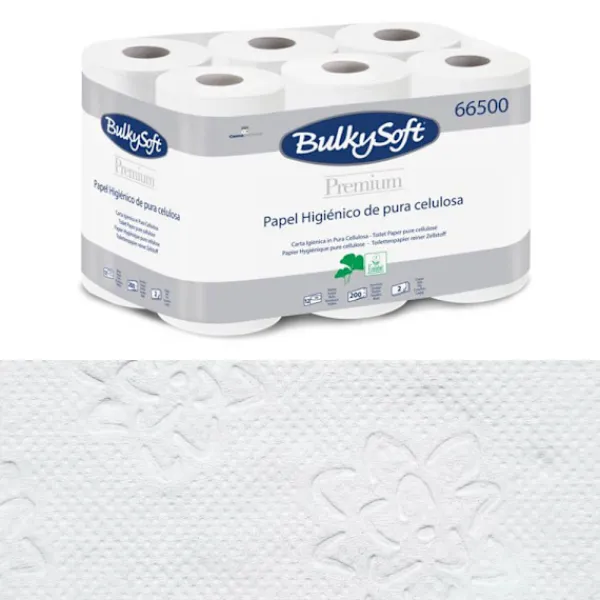 Bulkysoft Premium 24m dobbeltlags toiletpapir er et behageligt papir af høj kvalitet med en delikat finish. Papiret er fremstillet af ren cellulose med en høj hvidhed og fås i en pakke med 12 ruller, hvilket sikrer en lang holdbarhed.