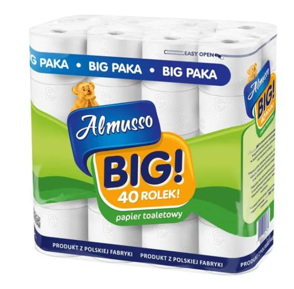 Almusso BIG! er en stor, økonomisk pakke med trelags toiletpapir, der kombinerer komfort og besparelser i ét. Vi har opnået papir af højeste kvalitet takket være moderne produktionsteknologi og en speciel præget bane. Cellulosen, vi har brugt, kommer fra certificerede vedvarende kilder, træplantager, og filmen er 100% genanvendelig. Trelags, gramvægt 3×15 g/m², rullelængde 11,55 m, rullehøjde 90 mm, antal ruller pr. pakke: 40