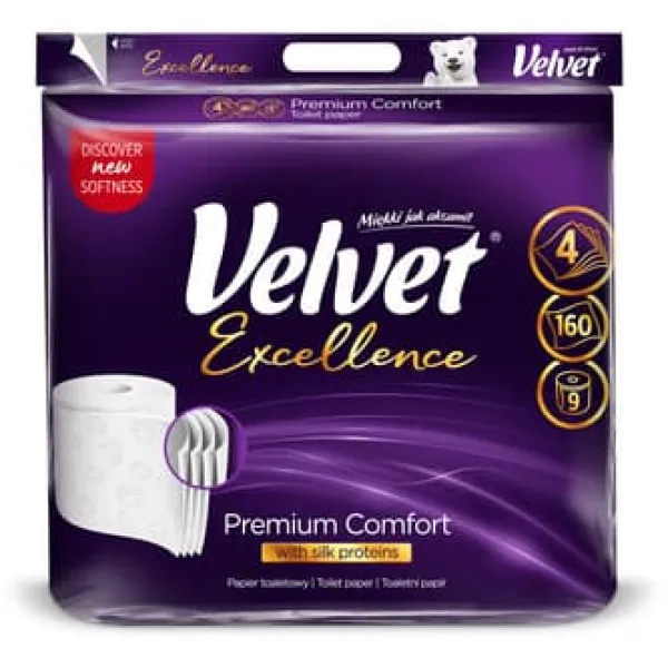Velvet Excellence Premium Comfort toiletpapir er en stor, perfekt opviklet rulle af stærkt papir, der består af fire lag unikt silkepapir beriget med silkeproteinekstrakt for en perfekt følelse af renlighed. De bløde, tykke, hvide ark, dekoreret med et elegant mønster, tilbyder ikke kun komfort og det højeste niveau af bekvemmelighed, men også enkelhed og minimalisme, der komplementerer indretningen af ethvert badeværelse.