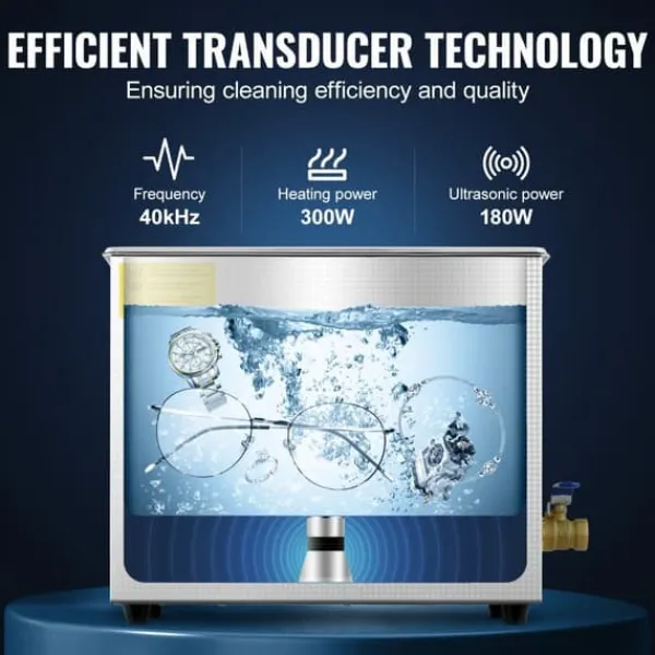 Det rustfrie låg med håndtag forhindrer varmespredning fra vandet. Skridsikre gummifodspositioner øger stabiliteten af den ultrasoniske smykkerenser.