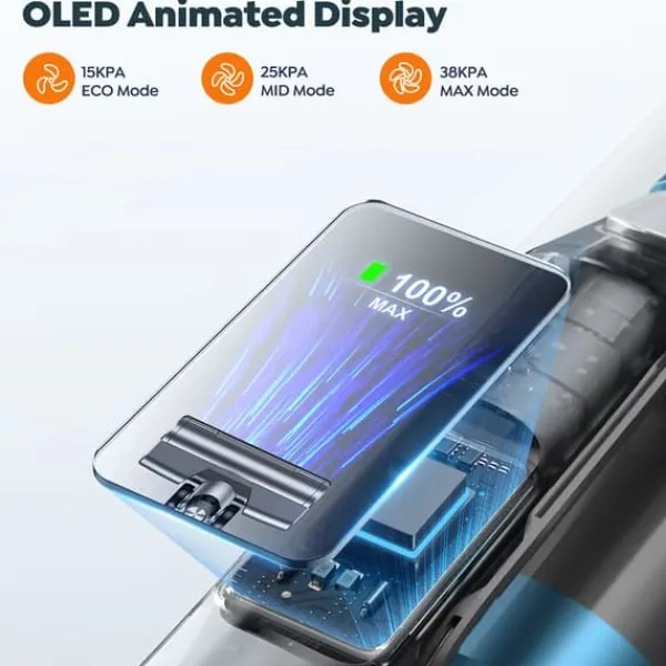 Kraftig ledningsfri støvsuger med 38 kPa sugestyrke og 450 W motor, der leverer dybderengøring på hårde gulve, tæpper og i smalle områder. OLED-skærm, motoriseret anti-filter-børste og oplyst gulvbørste gør rengøringen hurtig, smart og effektiv.