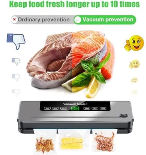 Automatisk og frisk længere op til 10 gange】: Med et automatisk forseglingssystem i vakuumforsegleren kan mad opbevares op til 10 gange længere uden konserveringsmidler, hvilket reducerer madspild og effektivt forhindrer tab af fugt, vitaminer, næringsstoffer og aromaer bevares. Velegnet til kød, fisk, frugt, grøntsager, pulver, ost osv.