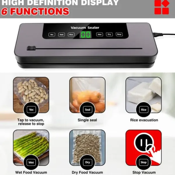 - alsidige forseglingsmuligheder: med fem forskellige forseglingsmetoder tør, vådt, ris, forsegl, og vac kan du nemt tilpasse vakuumforseglingsprocessen til forskellige typer mad, fra kød til korn.