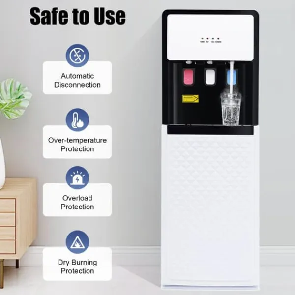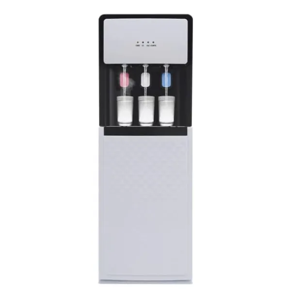 Koldt, varmt og stuetempereret vand på én maskine – nem, sikker og elegant Denne fritstående vanddispenser i hvid leverer koldt, varmt og vand ved stuetemperatur efter behov. Bundilæsset design gør flaskeskift let, mens 500 W opvarmning og 75 W køling giver hurtige resultater – ideel til hjem, kontor og reception.