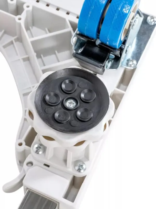 The telescopic design allows for precise size adjustment (37 – 63 x 37 – 63 cm). Uneven floors can be compensated for with the height-adjustable legs. The four integrated spirit levels ensure the washing machine base is perfectly aligned. Floor-friendly casters allow the base unit, including the washing machine, to be moved back and forth. The casters are, of course, lockable.