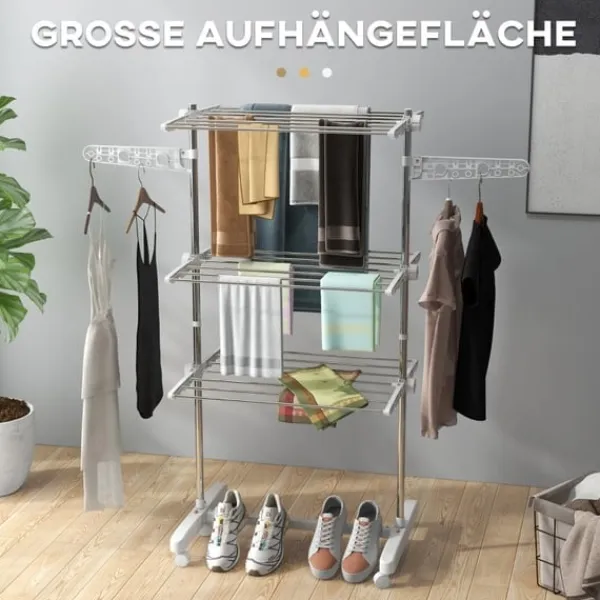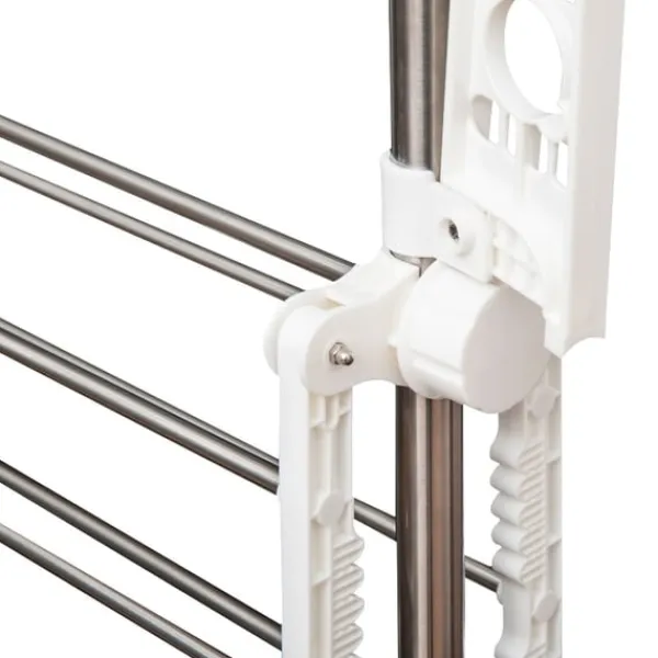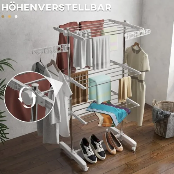 Justerbare funktioner: Sidestangen og varehylden har justerbare højder, hvilket gør den perfekt til at hænge skjorter og andet tøj på, hvilket sikrer optimale tørreforhold.