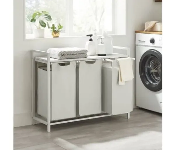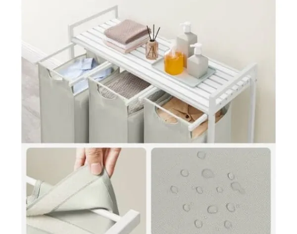 [3 rum til opdelte opbevaring] Vaskeriet har en samlet kapacitet på 114L, hvor hver foring har 38L. Dens 3-rum-design giver dig mulighed for at organisere dit vaskeri efter type og separate lysvaskeri fra mørke [Slatted Storage hylde] Denne vaskeri hæmmer en hylde, der giver ekstra plads til at organisere vaskemidler eller toiletartikler. Dens spalte design giver luft mulighed for at strømme igennem for god ventilation, hvilket forhindrer opbygning af lugt fra vaskeri [Udtræk og aftagelige foringer] Hver foring er udstyret med et plastik bundpanel for at forhindre sagging, og takket være hook-and-loop-fastgørelseselementet kan du ubesværet trække og fjerne disse foringer for let at transportere dem til vaskemaskinen [Robust og stabil] Udformet med en 2 cm stålrørramme og MDF -panel, denne vaskeri understøtter op til 20 kg på sin øverste hylde. Derudover er hver foring lavet af vandafvisende Oxford-stof, og de fire justerbare fødder giver stabilitet [Alsidig] Denne alsidige vaskeri passer problemfrit ind i ethvert rum, hvad enten det er dit vaskerum, badeværelse eller soveværelse. Brug det til at organisere dit vaskeri, uanset hvor du har brug for lidt ekstra plads