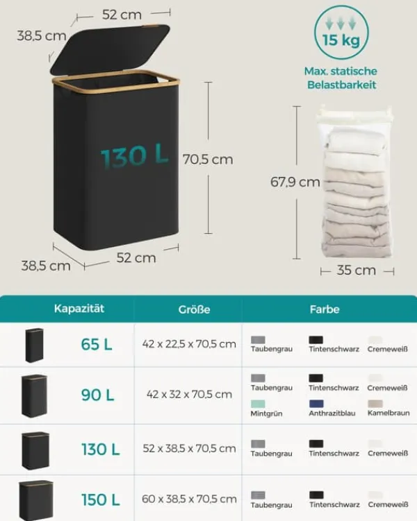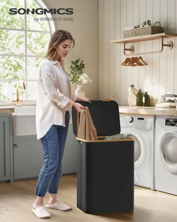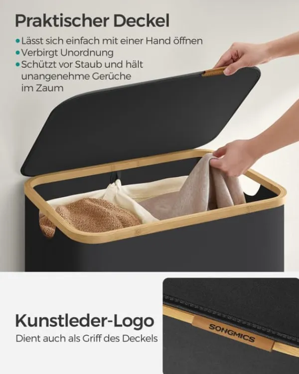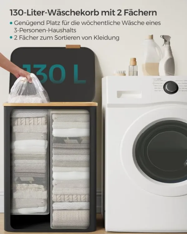 [2 rummelige rum] Denne 130 liters vasketøjskurv, der måler 52 x 38,5 x 70,5 cm og har 2 rum, er perfekt designet til at sortere og opbevare vasketøj for en familie på tre personer, hvilket forenkler din vaskerutine.[Praktisk låg med håndtag] Vasketøjskurven har et låg, der ikke kun holder støv væk, men også beskytter privatlivet ved at skjule rodet. Logoet i kunstlæder på låget fungerer som et håndtag til nem åbning og tilføjer et strejf af elegance.[Aftagelige og alsidige foringer] Foringerne, der er fastgjort med velcrolukning, kan nemt tages af, og deres snore fungerer som håndtag, så de er nemme at bære. Deres mesh-design gør det muligt at bruge dem som vaskepose til sorteret vask i maskinen.[Holdbar og robust] Vasketøjskurven er fremstillet af 600D tykt Oxford-stof og kan prale af at være vandafvisende, rivefast og nem at rengøre. Dens indre struktur, der understøttes af glasfiberstænger, sikrer stabilitet ved regelmæssig brug.[Let at samle] Med klare instruktioner og uden brug af værktøj kan du nemt sætte vasketøjskurven op på bare 5 minutter.