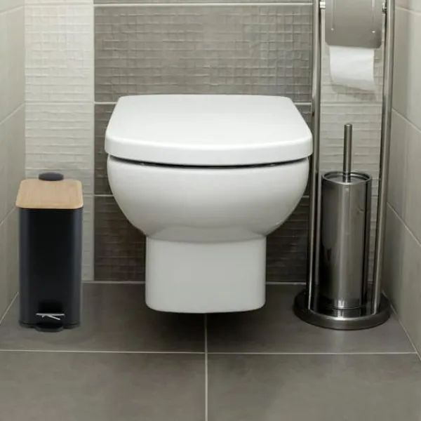 Denne affaldsspand kombinerer moderne design med miljøvenlige materialer, fremstillet af pulverbelagt stål og naturligt bambustræ. Den sorte pedal-spand har en elegant mat finish, med et låg i bambustræ, der giver et unikt, naturligt udseende. Det praktiske pedalsystem gør det muligt at åbne låget uden at bruge hænder, hvilket er hygiejnisk og praktisk. Den indre spand, udstyret med et håndtag, gør tømning nem. Den plastikbeklædte bund beskytter dit gulv mod ridser. På bagsiden er der et ekstra metalhåndtag til nem transport eller ophængning. Med en kapacitet på 5 liter er denne affaldsspand perfekt til badeværelser, der prioriterer stil og bæredygtighed.