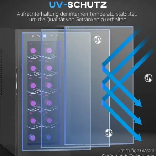 – Forbedret isolering: Vin køleskabets tredelte glasdør med skumteknologi og UV-bestandighed sikrer optimal isolering og beskyttelse og bevarer drikkevarernes kvalitet. Kompletteret med et hyggeligt blåt ovenlys og en dør med et glasvindue for synlig skønhed.