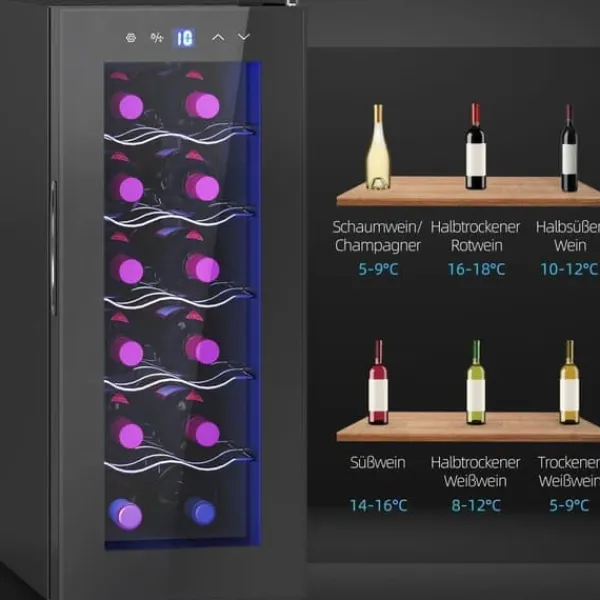 – Alsidig opbevaring: Udstyret med fem forkromede hylder har dette vinkøleskab plads til op til 12 standardvinflasker og takket være de justerbare hylder også plads til større champagneflasker