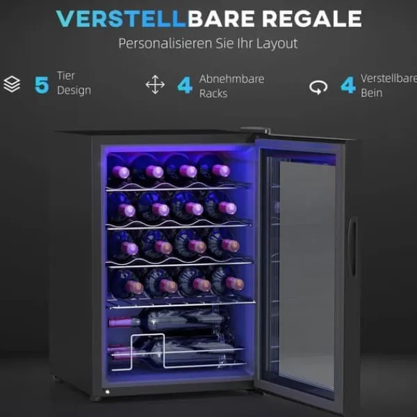– Rummelig opbevaring: Har fem hylder i vinkøleskabet med højdejusterbart og aftageligt design, plads til op til 20 standardvinflasker samt større champagneflasker og sikrer overskuelig opbevaring af dine yndlingsdrikke