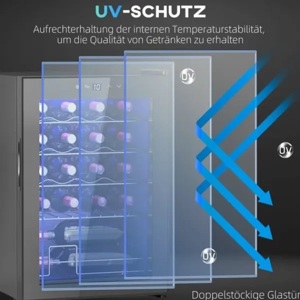 – UV-beskyttet glasdør: Den dobbeltglasede, UV-resistente dør på drikkevarekøleskabet garanterer en konstant indvendig temperatur og beskytter dine drikkevarer. Det bløde blå ovenlys giver desuden et elegant touch